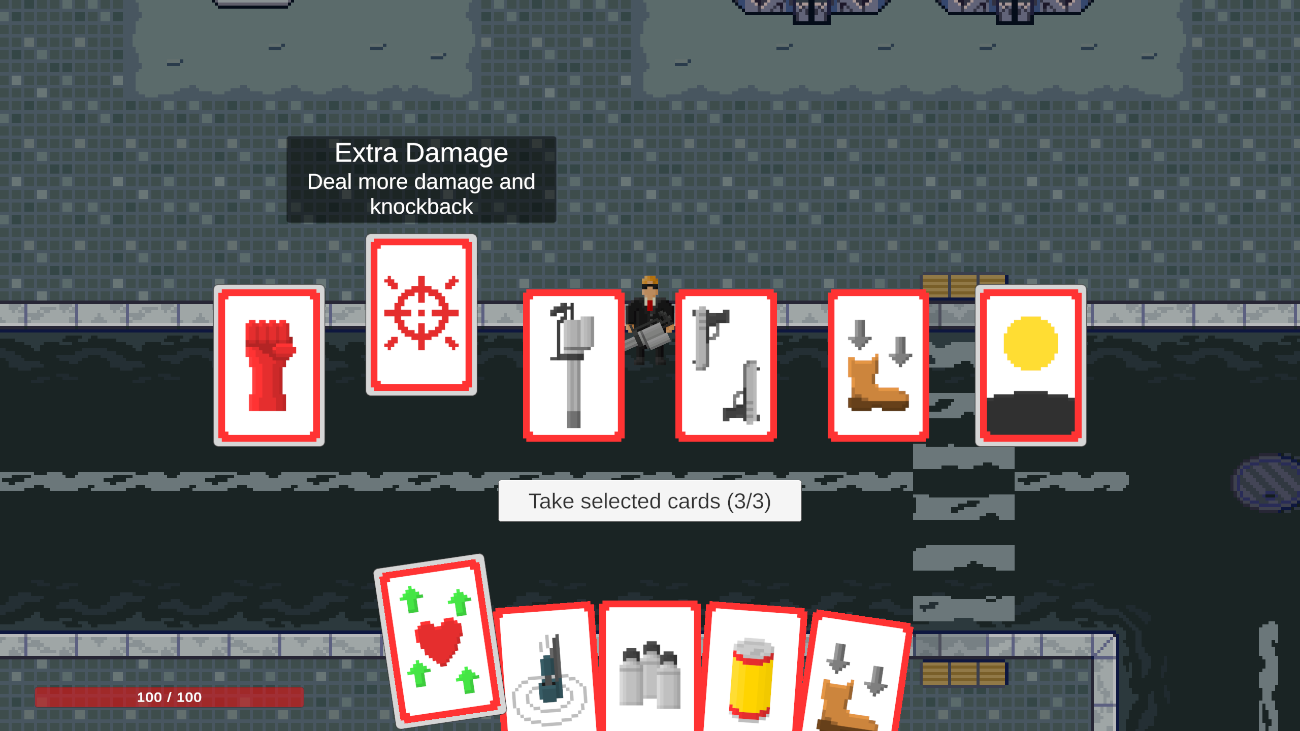 You are given magical cards in the style of Hanafuda that give you various buffs, weapons and abilities for an advantage over the rapidly increasing waves of enemies. After each wave, you get to choose 3 more cards to add to your hand.